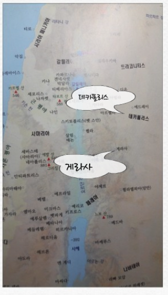 "그들은 호수 건너편 게라사인들의 지방으로 갔다."(마르 5,1) 예수님과 제자들이 호수를 건너 다가간 곳은 호수의 동쪽 지역인 게라사 지방이라고 5,1에 마르코가 설명하는데, 게라사는 갈릴래아 호수에서 동남쪽으로 무려 55km나 떨어져 있기 때문에 마르 5,14절에서 나오는 이 고을의 얘기는 사실 거리감이 있어요. 사실 맞지 않는다는 겁니다. 즉 마귀 들린 돼지들이 달리기에는 너무 먼 곳이에요