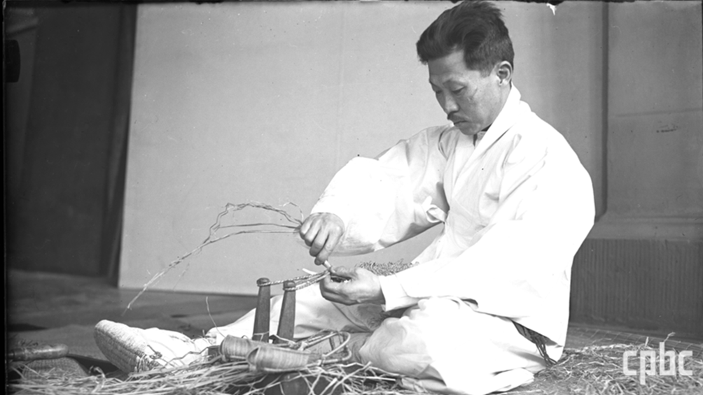 - 짚신틀로 짚신 삼는 모습을 재현하는 안봉근