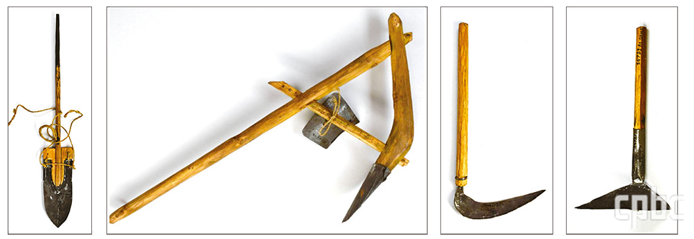 - 안봉근이 만든 모형 농기구인 가래, 겨리쟁기, 낫, 호미(왼쪽부터). 드레스덴민족학박물관 소장