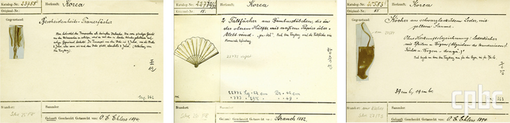 - 유물을 설명하는 데 안봉근의 도움을 받았다는 내용이 적혀 있는 포선·합죽선·궁갑 유물카드(왼쪽부터). 드레스덴민족학박물관 소장