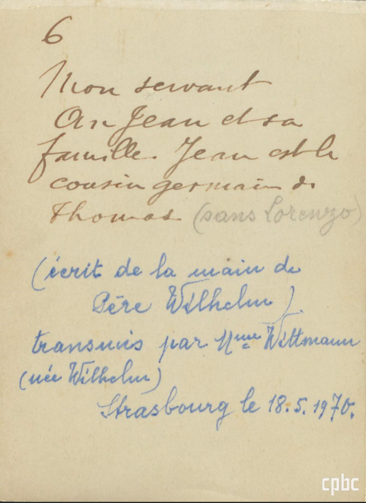 - 위 사진 뒷면의 갈색 글씨가 빌렘 신부의 친필이다. “나의 복사 요한과 그의 가족. 요한은 토마스의 사촌”