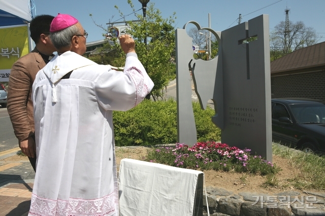 - 인천교구장 최기산 주교가 5월 10일 강화도 옛 심도직물 공장터에서 ‘강화 심도직물 사건’ 기념 조형물을 축복하고 있다.