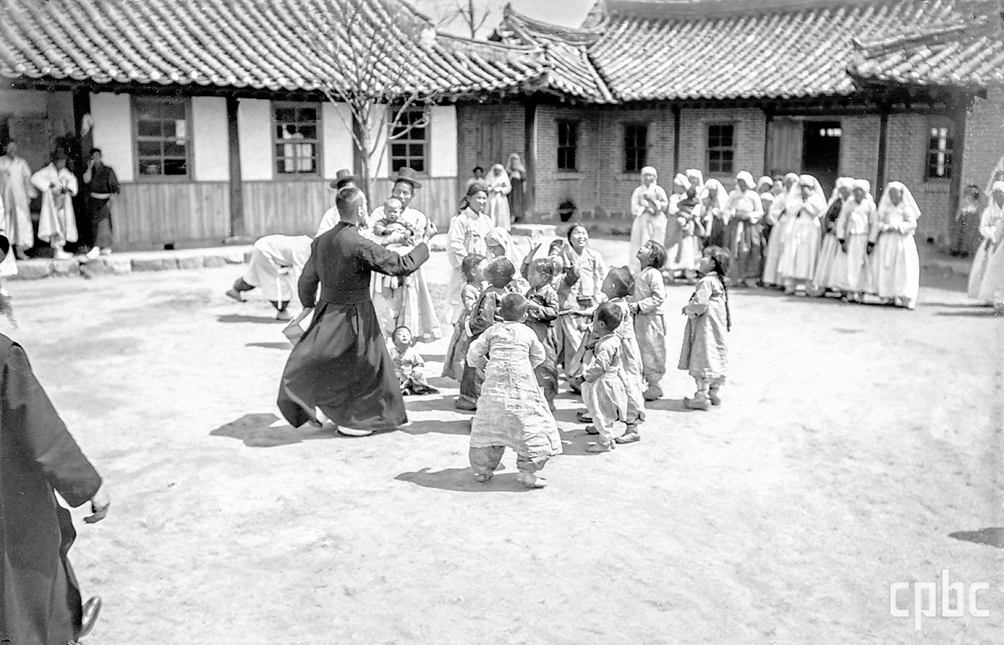 - <사진 3> 노르베르트 베버, ‘루블레 신부와 아이들’, 1911년 4월 23일, 유리건판, 국외소재문화유산재단, 독일 상트 오틸리엔수도원 아카이브 소장 한국 사진.