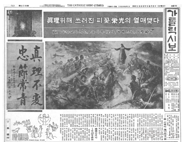 - 1968년 거행된 병인박해 순교복자 24위 시복식은 전 세계에 한국교회 순교 영성을 일깨운 순간이 됐다. 가톨릭신문 자료사진 - 가톨릭시보 1968년 10월 6일자 1면. 가톨릭신문 자료사진