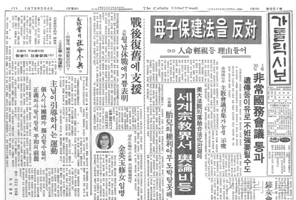 “모자보건법을 반대 - 합법적인 낙태 수술의 범위를 확대하고 실질적인 강제 불임 수술의 근거를 마련해주는 모자보건법이 1월 30일 비상국무회의에서 통과되자, 교회 내에서는 이 법으로 인해 생겨날 인명 경시 풍조와 가치 질서의 전도, 도덕적 피폐, 모체의 건강 위험 등 갖가지 부작용을 크게 우려하면서 반대 의사를 분명히 하고 있다.”(가톨릭시보 1973년 2월 4일자 1면 중에서)